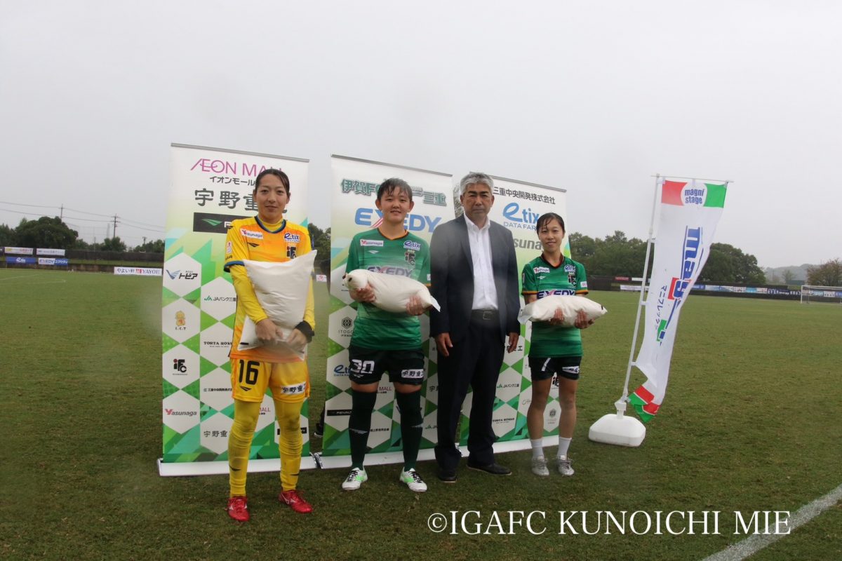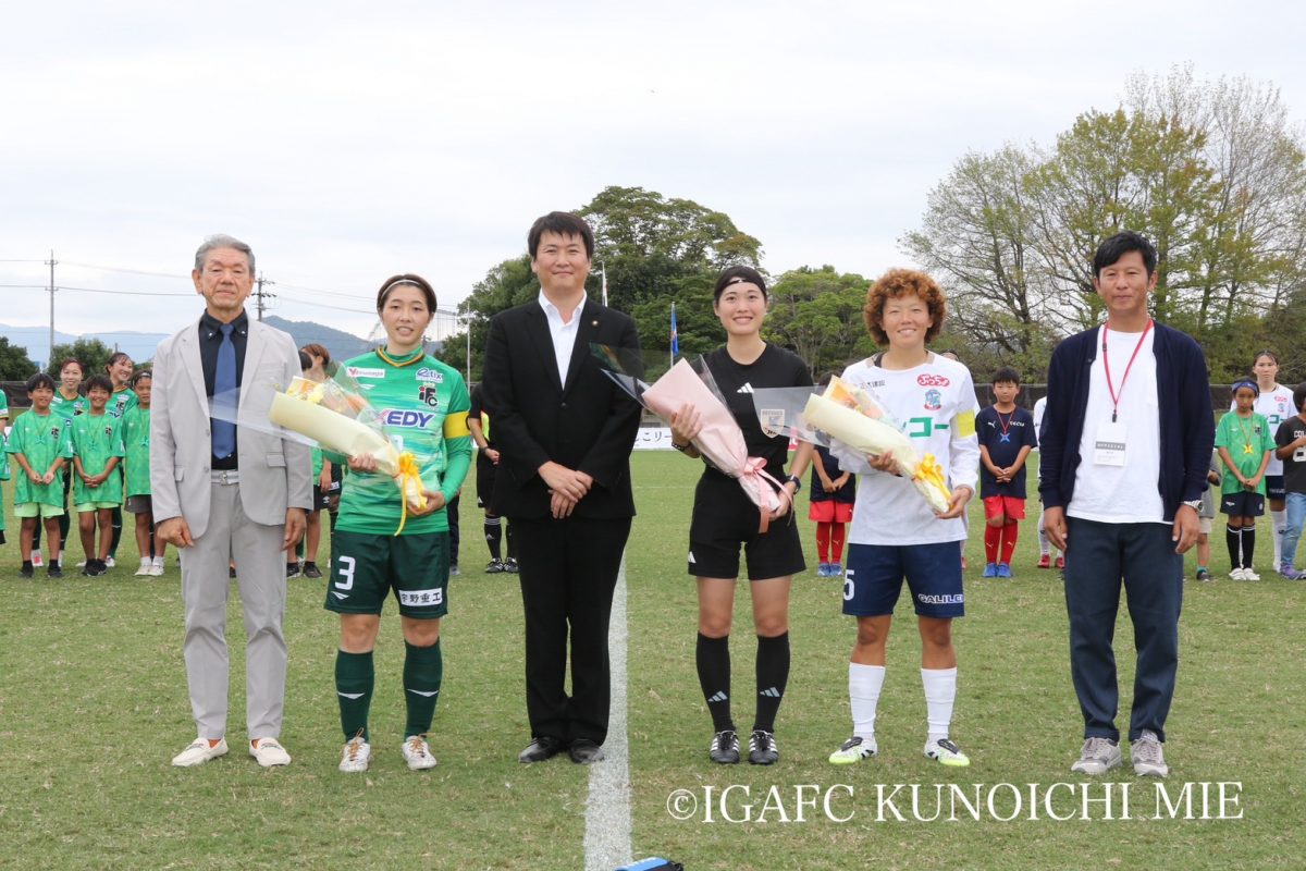 本日の試合はトップパートナーの三重中央開発株式会社様 スポンサーデーであり、キックオフ前には主審・両チームキャプテンに三重中央開発株式会社 取締役 森田 憲一様・取締役三重事業所長 前山 泰彦様・伊賀市を代表して伊賀市長 稲森稔尚様より花束が贈られました。