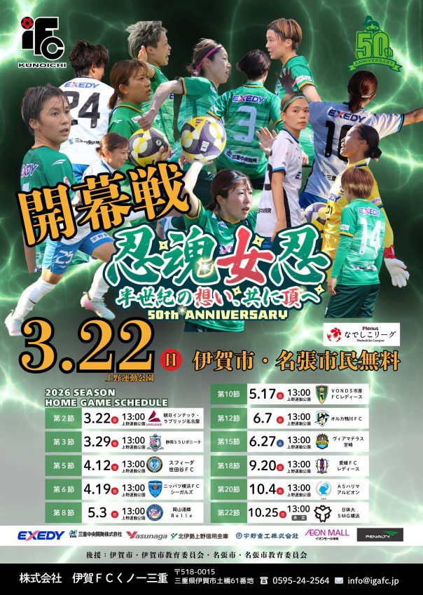 2026年3月22日(日)2026プレナスなでしこリーグ1部 第2節 朝日インテック・ラブリッジ名古屋戦のホーム開幕戦を伊賀市民、名張市民の方々を無料招待致します!