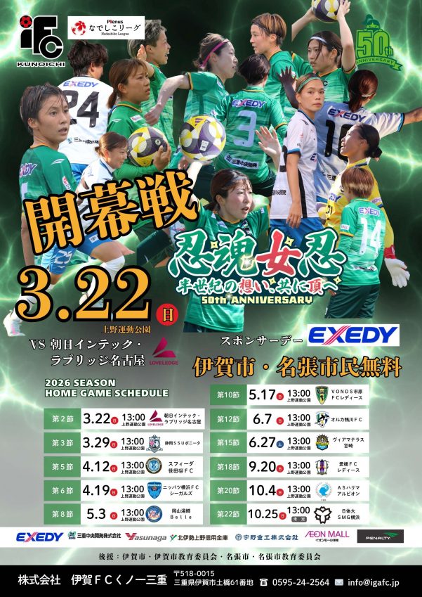 3月22日(日)に開催致します2026プレナスなでしこリーグ1部 第2節 伊賀FCくノ一三重 vs 朝日インテック・ラブリッジ名古屋戦イベント&グッズ情報をお知らせ致します。