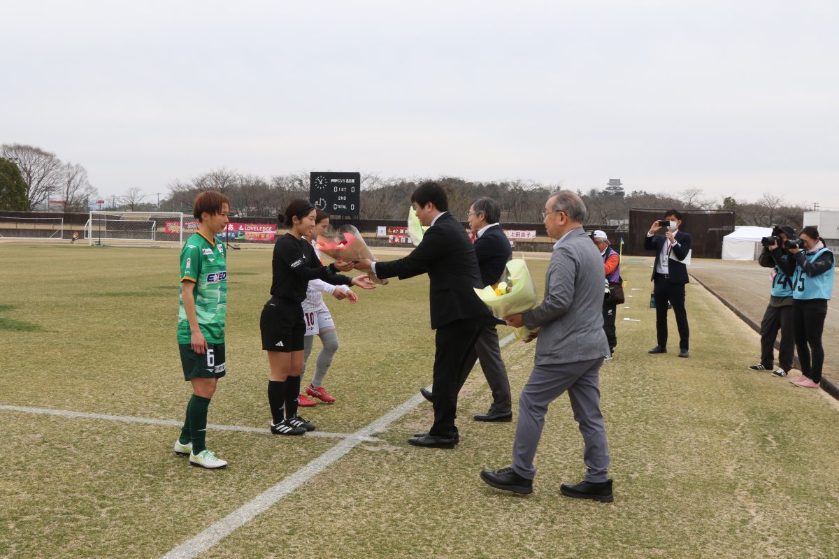 キックオフ前には主審・両チームキャプテンに伊賀市 稲森 稔尚市長様・株式会社エクセディ 上級執行役員 山村 佳弘様・執行役員 上野事業所長 吉田 洋一様より花束が贈られました。